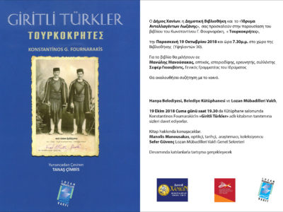 Konstantinos G. Fournarakis’in “Giritli Türkler-Tourkokirites” adlı kitabının tanıtımı 19 Ekim 2018 Cuma akşamı Hanya Belediye Kütüphanesi salonunda yapıldı. Toplantıda Hanya’lı yazar Manolis... Read More