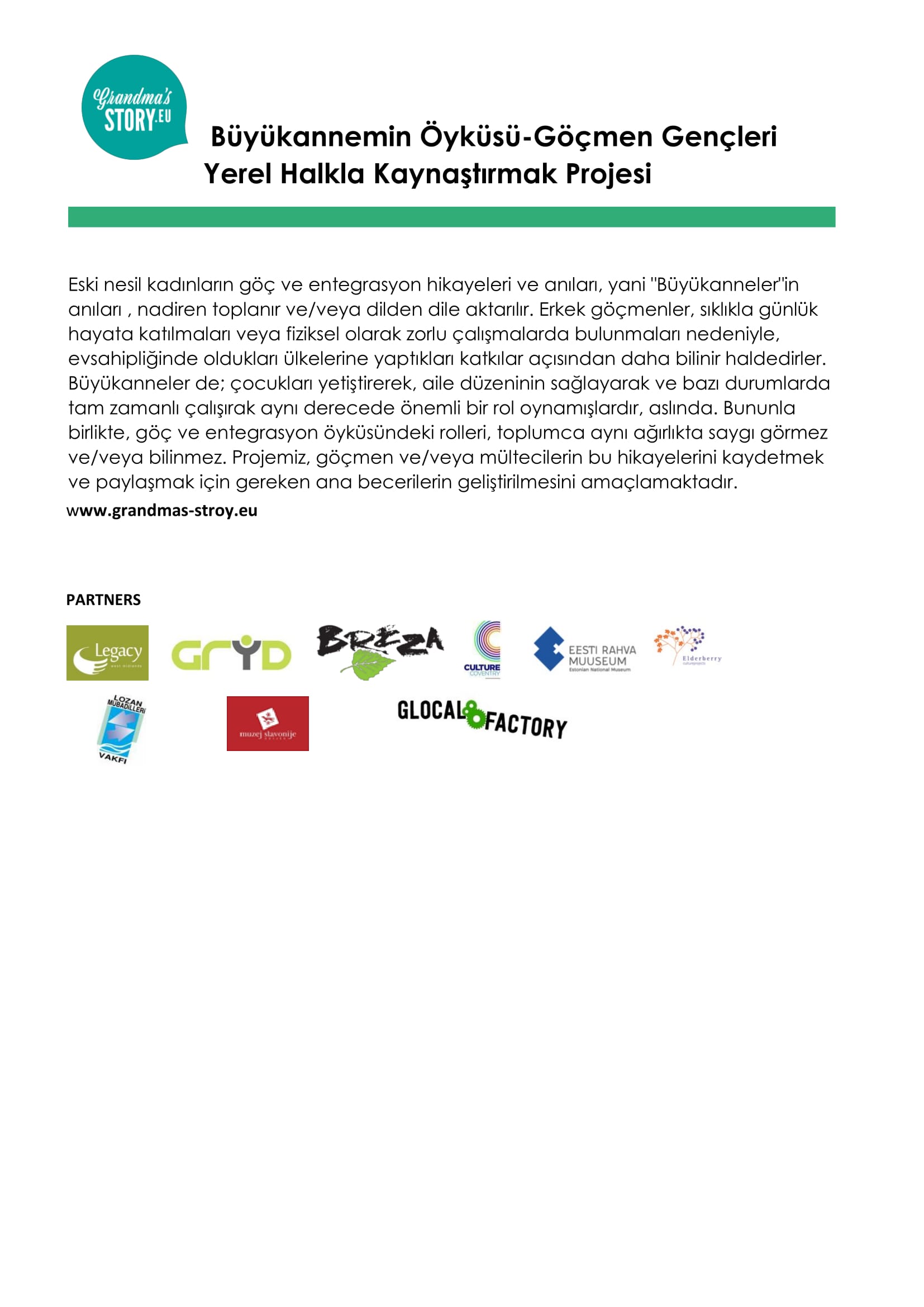 Eski nesil kadınların göç ve entegrasyon hikayeleri ve anıları, yani “Büyükanneler”in anıları , nadiren toplanır ve/veya dilden dile aktarılır. Erkek göçmenler, sıklıkla günlük hayata katılmaları veya fiziksel olarak zorlu çalışmalarda bulunmaları nedeniyle, evsahipliğinde oldukları ülkelerine yaptıkları katkılar açısından daha bilinir haldedirler. Büyükanneler de; çocukları yetiştirerek, aile düzeninin sağlayarak ve bazı durumlarda tam zamanlı çalışırak aynı derecede önemli bir rol oynamışlardır, aslında. Bununla birlikte, göç ve entegrasyon öyküsündeki rolleri, toplumca aynı ağırlıkta saygı görmez ve/veya bilinmez. Projemiz, göçmen ve/veya mültecilerin bu hikayelerini kaydetmek ve paylaşmak için gereken ana becerilerin geliştirilmesini amaçlamaktadır.