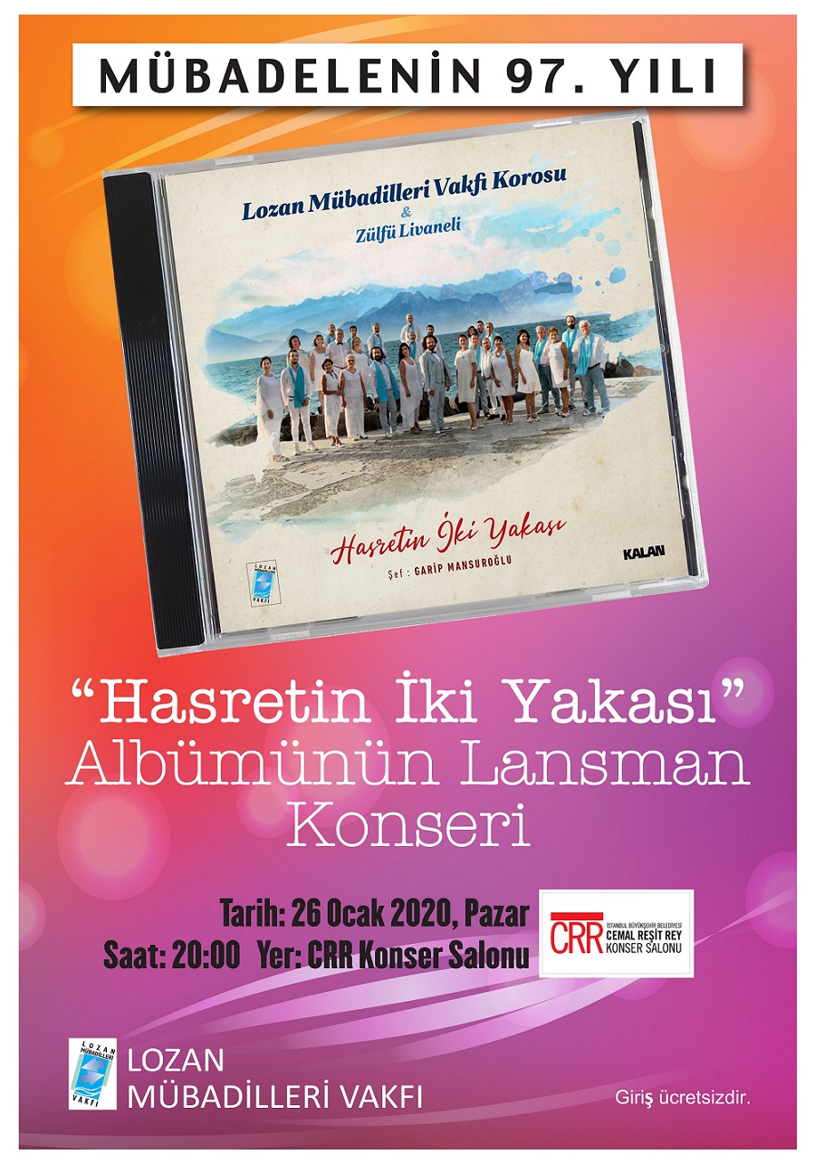 Lozan Mübadilleri Vakfı Korosu, ilk albümü “Hasretin İki Yakası” konseri ile dinleyiciyle buluşuyor. Ünlü müzisyen Zülfü Livaneli’nin de “Memleket Kokulu Yarim” adlı şarkısının bulunduğu ve koro ile birlikte söylediği albümün konseri 26 Ocak 2020 tarihinde Cemal Reşit Rey konser salonunda.